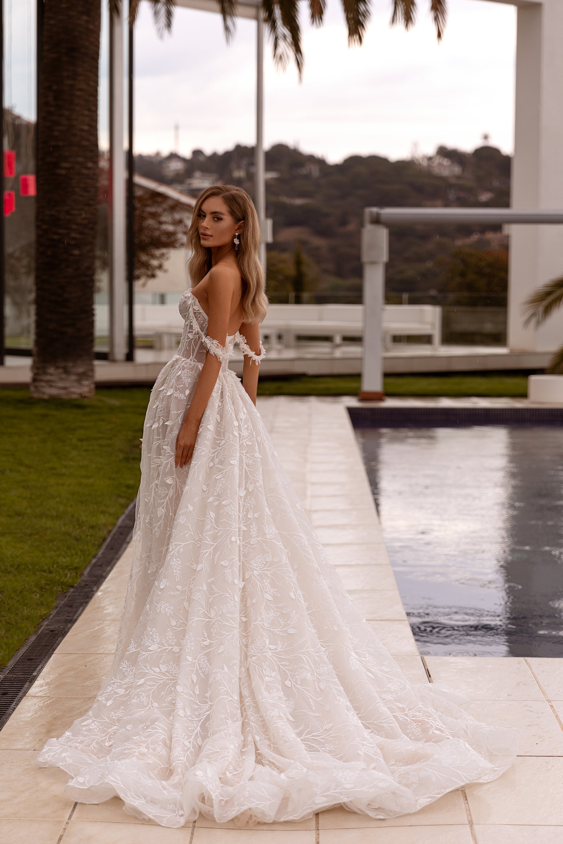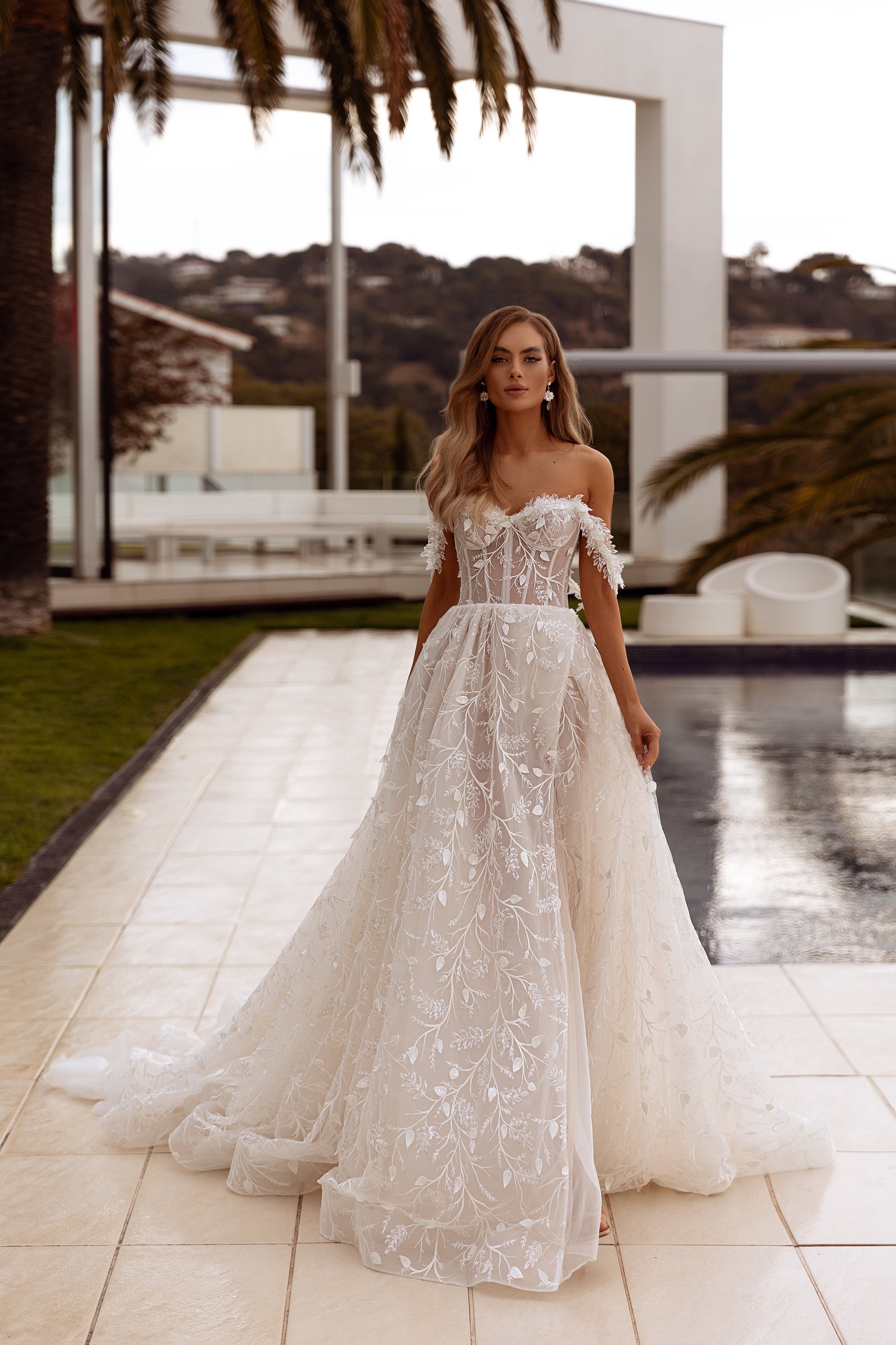 Sally is a celestial vision in cappuccino hues, blending ethereal tulle with intricate guipure lace, sequins, and 3D embellishments. The daring slit and off-shoulder straps elevate its enchanting design, making it perfect for the bride who craves a heavenly gown with undeniable charm.