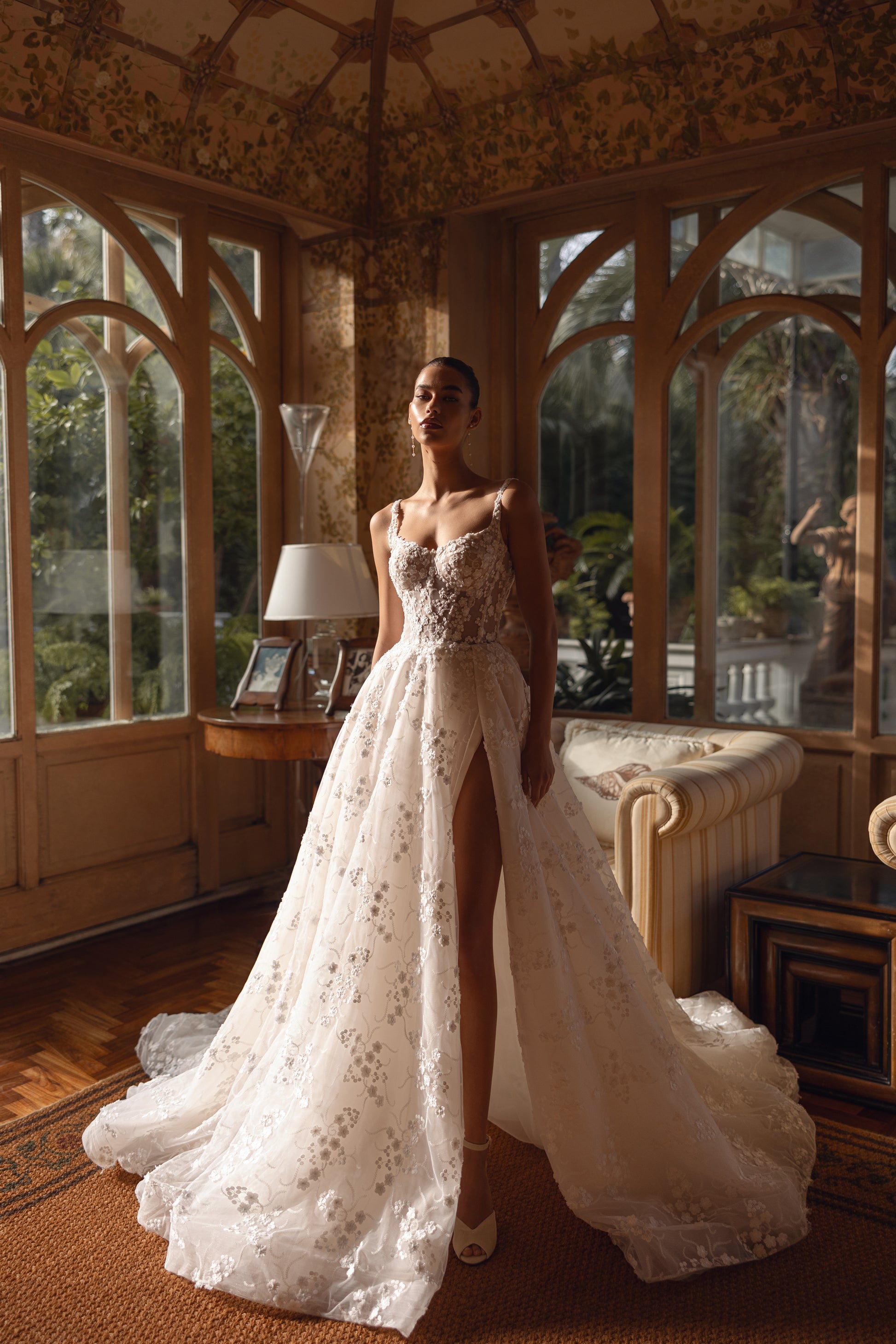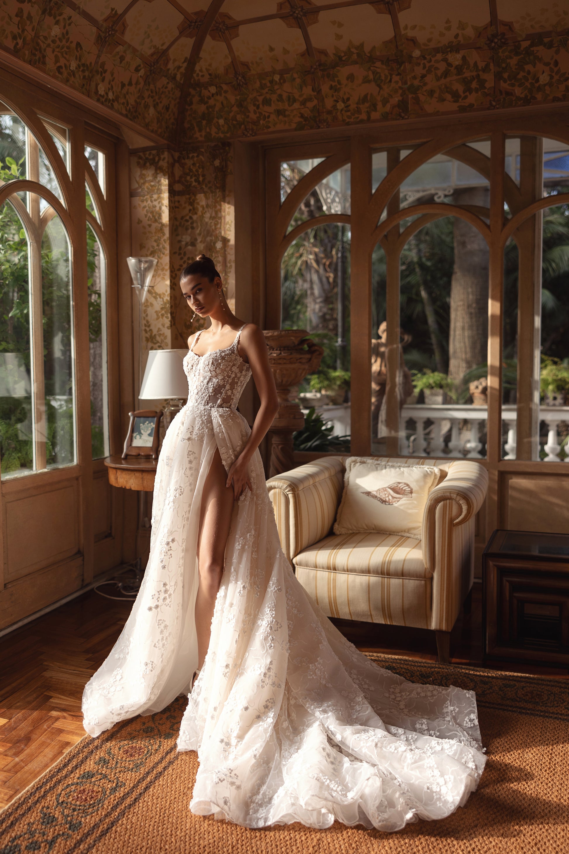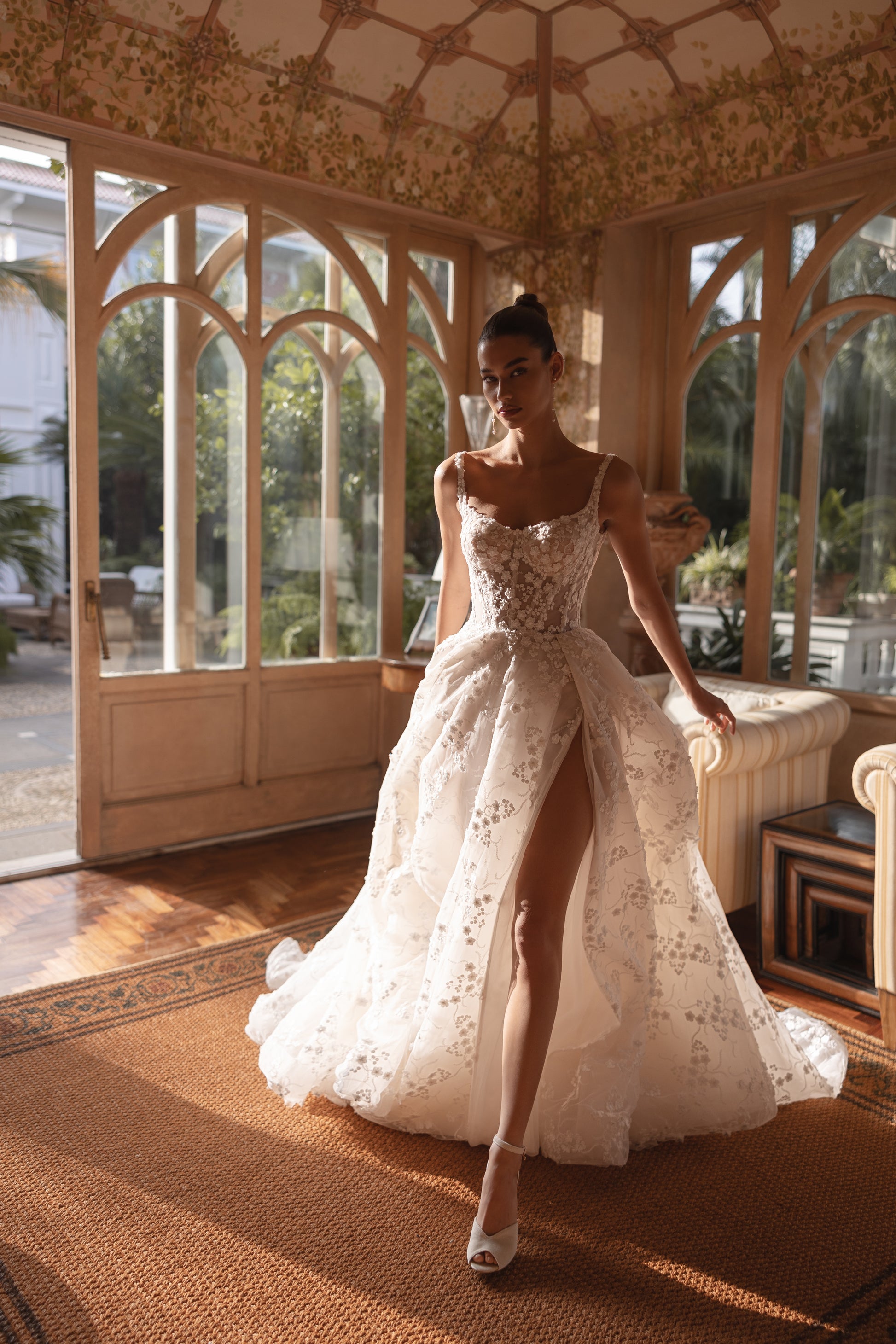 Unassuming yet captivating, this guipure dress pairs romantic simplicity with a daring high slit. The floral-adorned straps add a touch of softness, making it effortlessly charming for those who appreciate understated elegance.