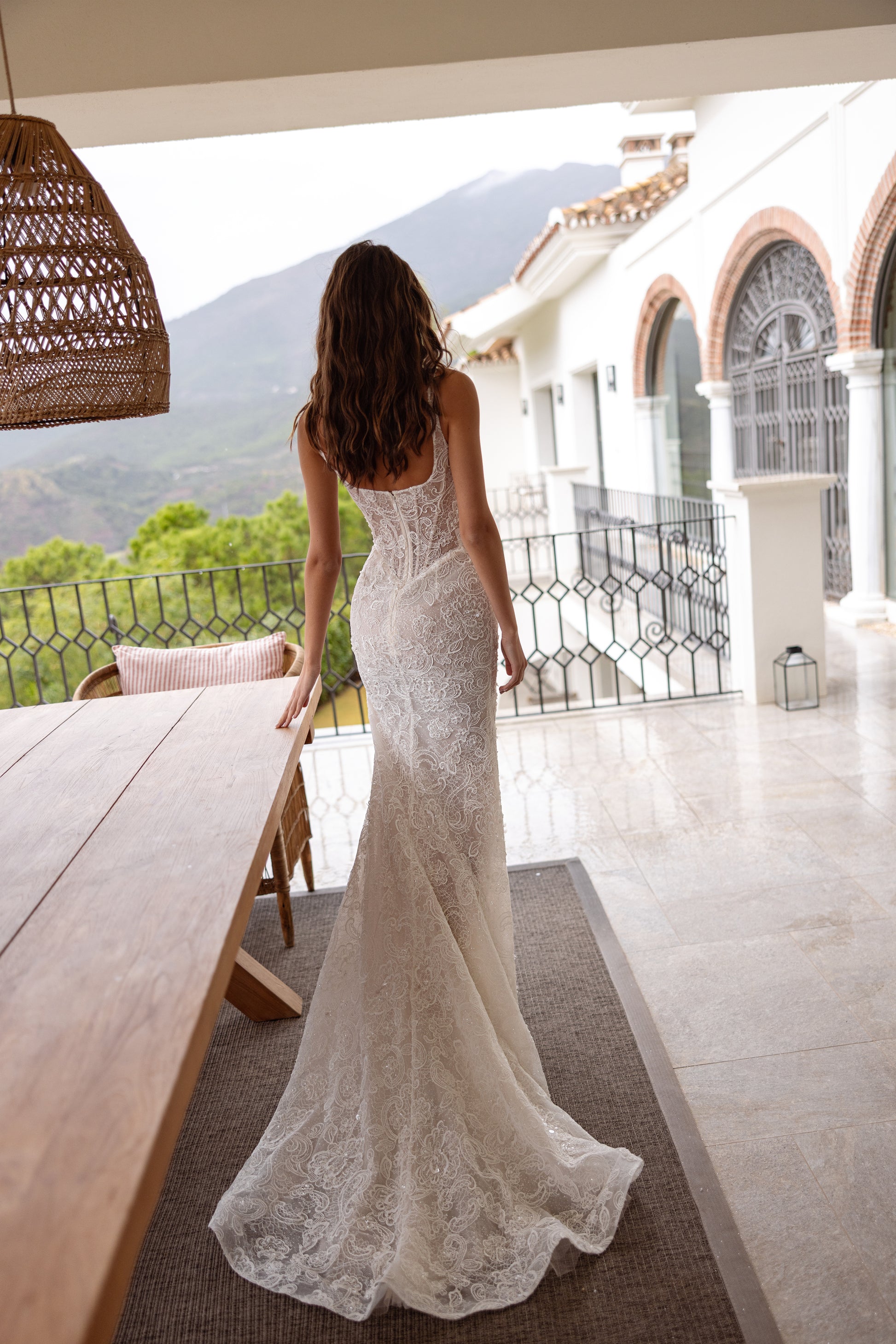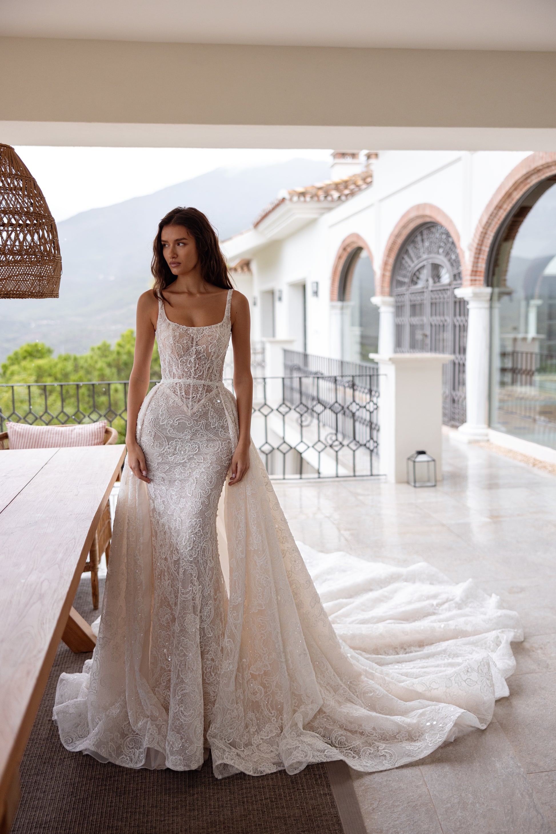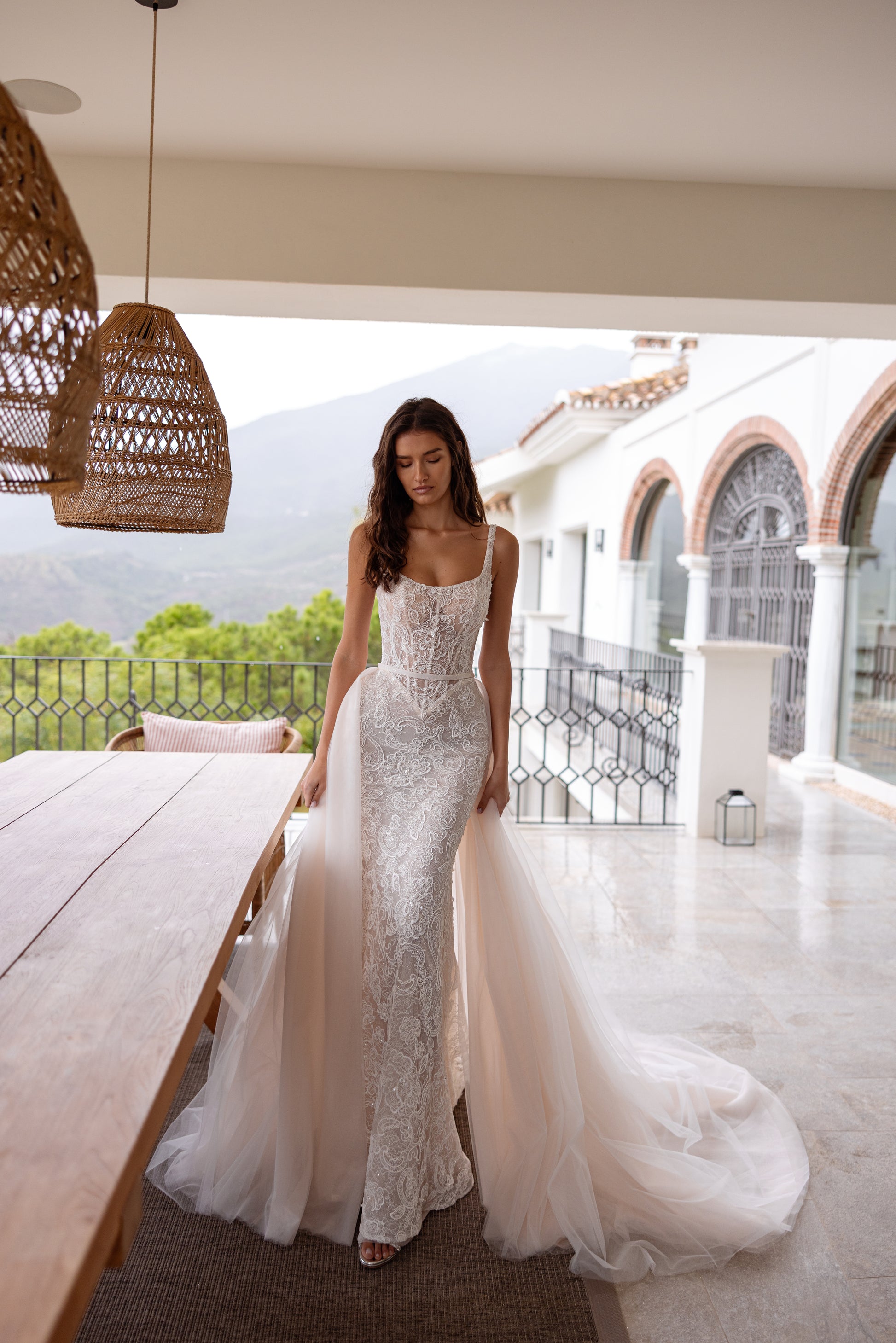 Serene is a transformer gown that offers multiple bridal looks in one. The base dress is a sleek mermaid silhouette with a structured corset and a modern square neckline, giving it a clean, elegant, almost aristocratic feel. The bodice is shaped with precise corsetry lines to define the waist, while corded French lace adds depth and dimension across the gown. A subtle glitter base creates a soft, luxurious glow. Its signature feature is the option of two detachable overskirts: one in airy tulle for a princess-like volume, and one in textured lace for a more couture, statement-making look.