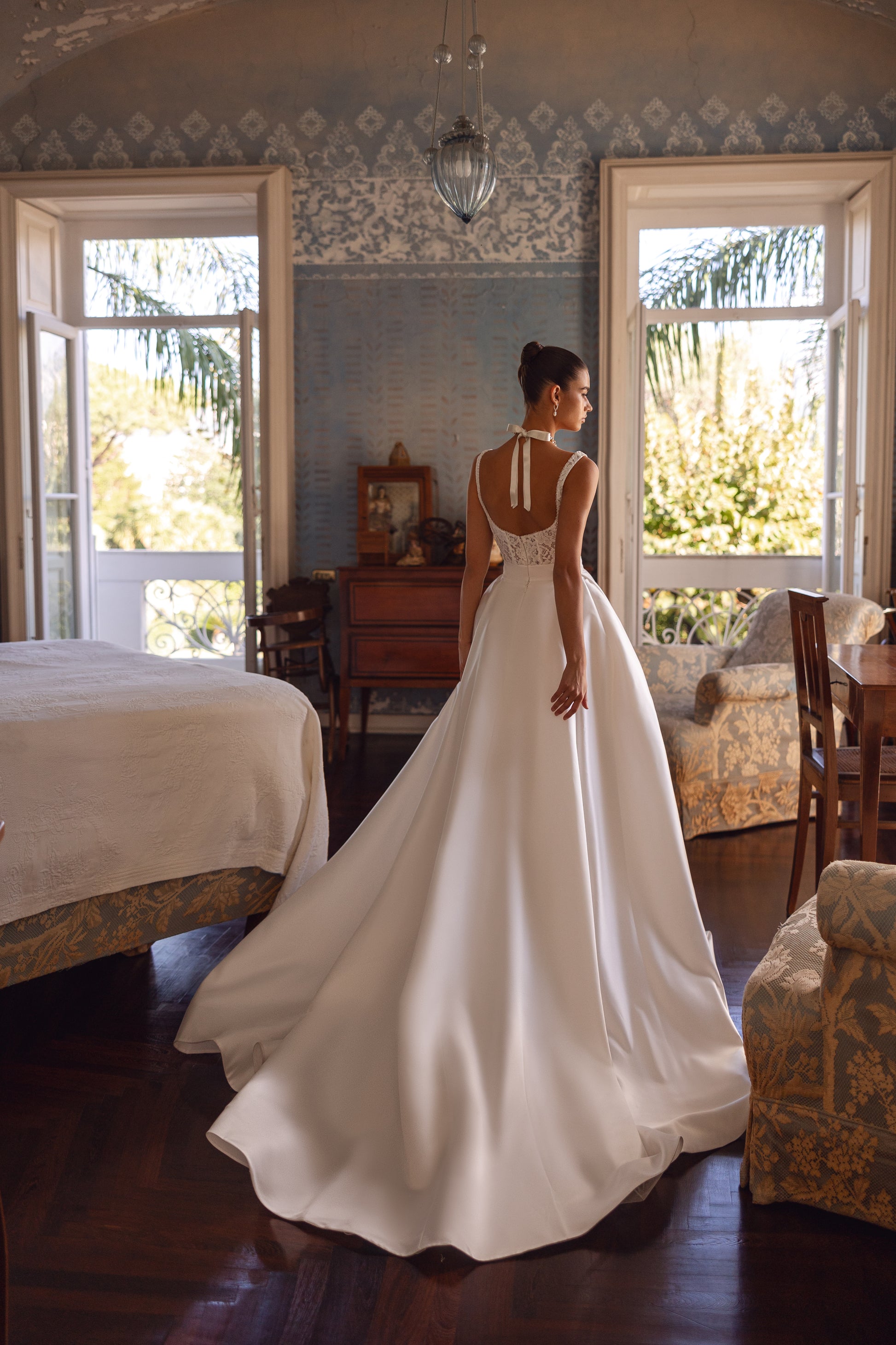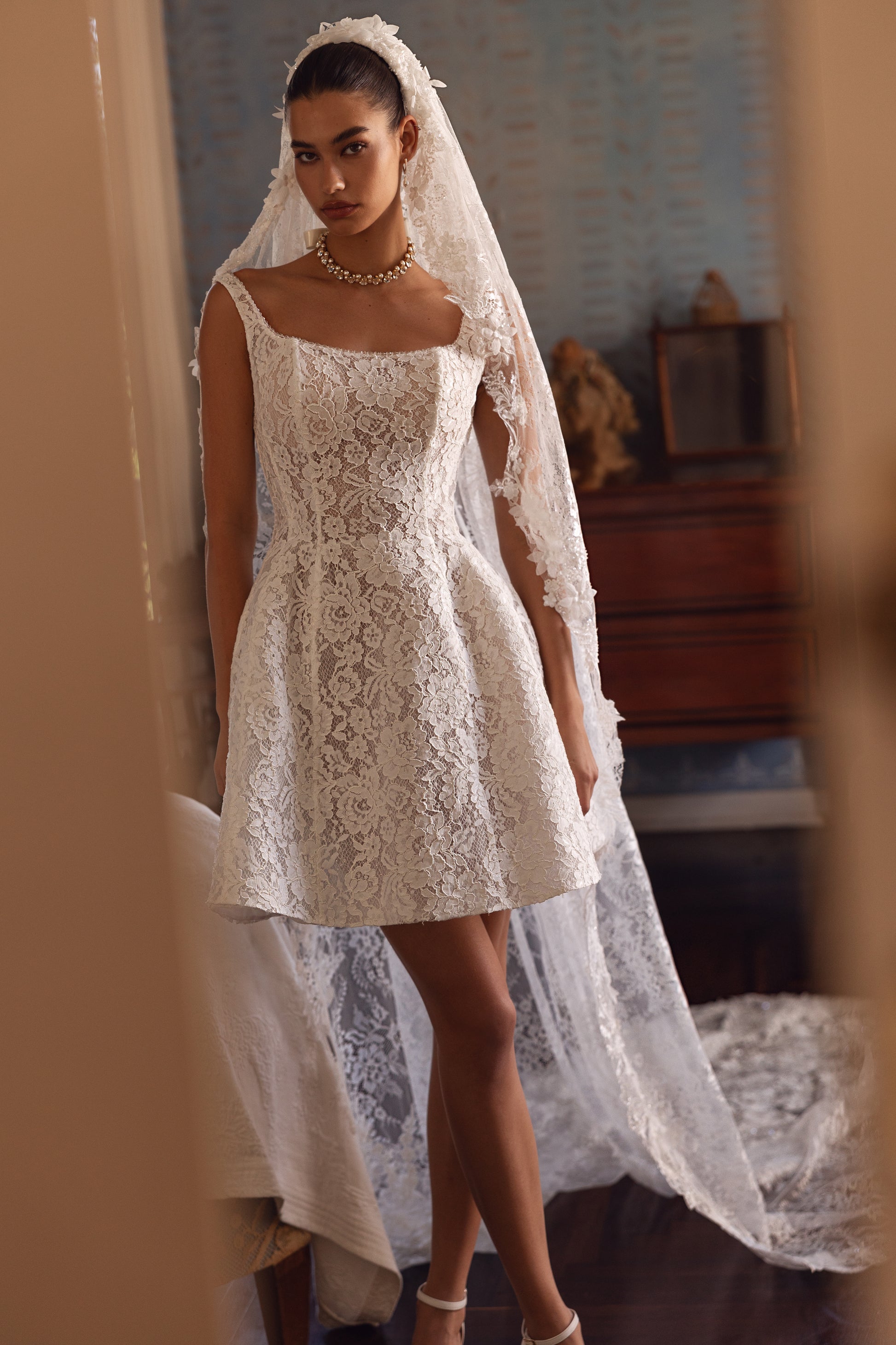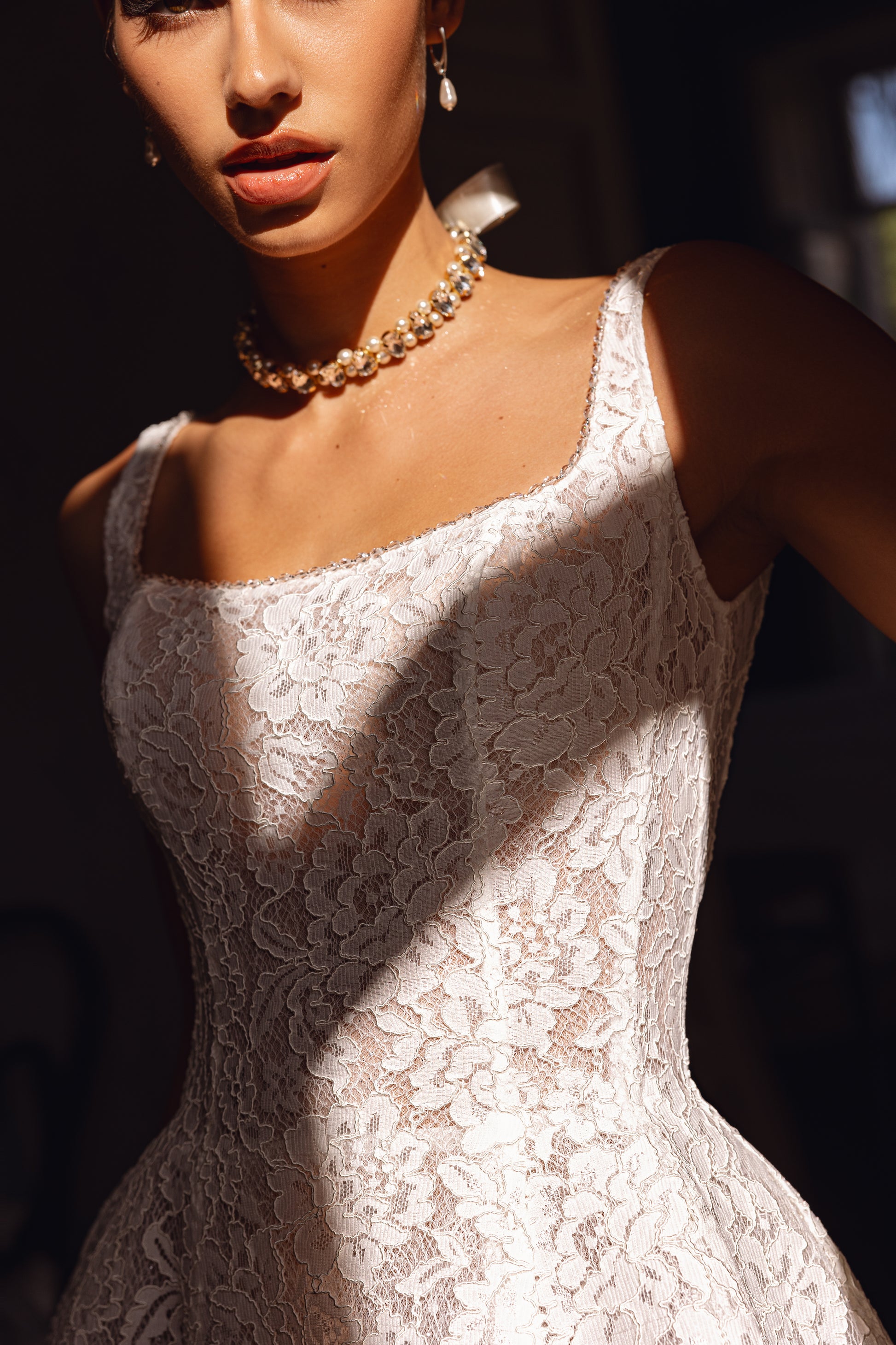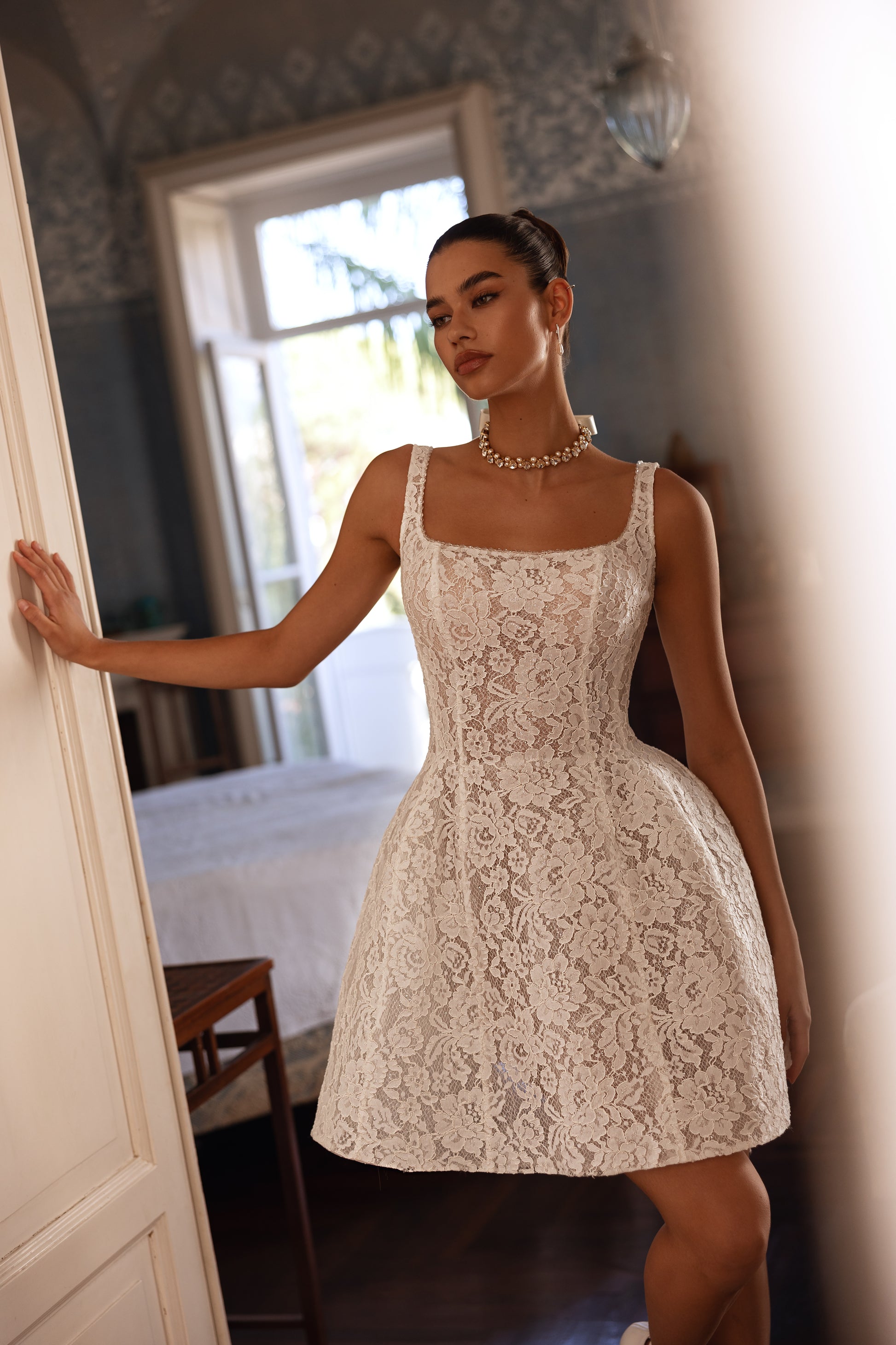 A masterclass in duality, this guipure gown transforms with ease. The playful mini base evokes a joyful energy, while the satin overskirt lends an air of majesty and class. Straight straps and a clean neckline add a touch of bold modernity to this versatile masterpiece.