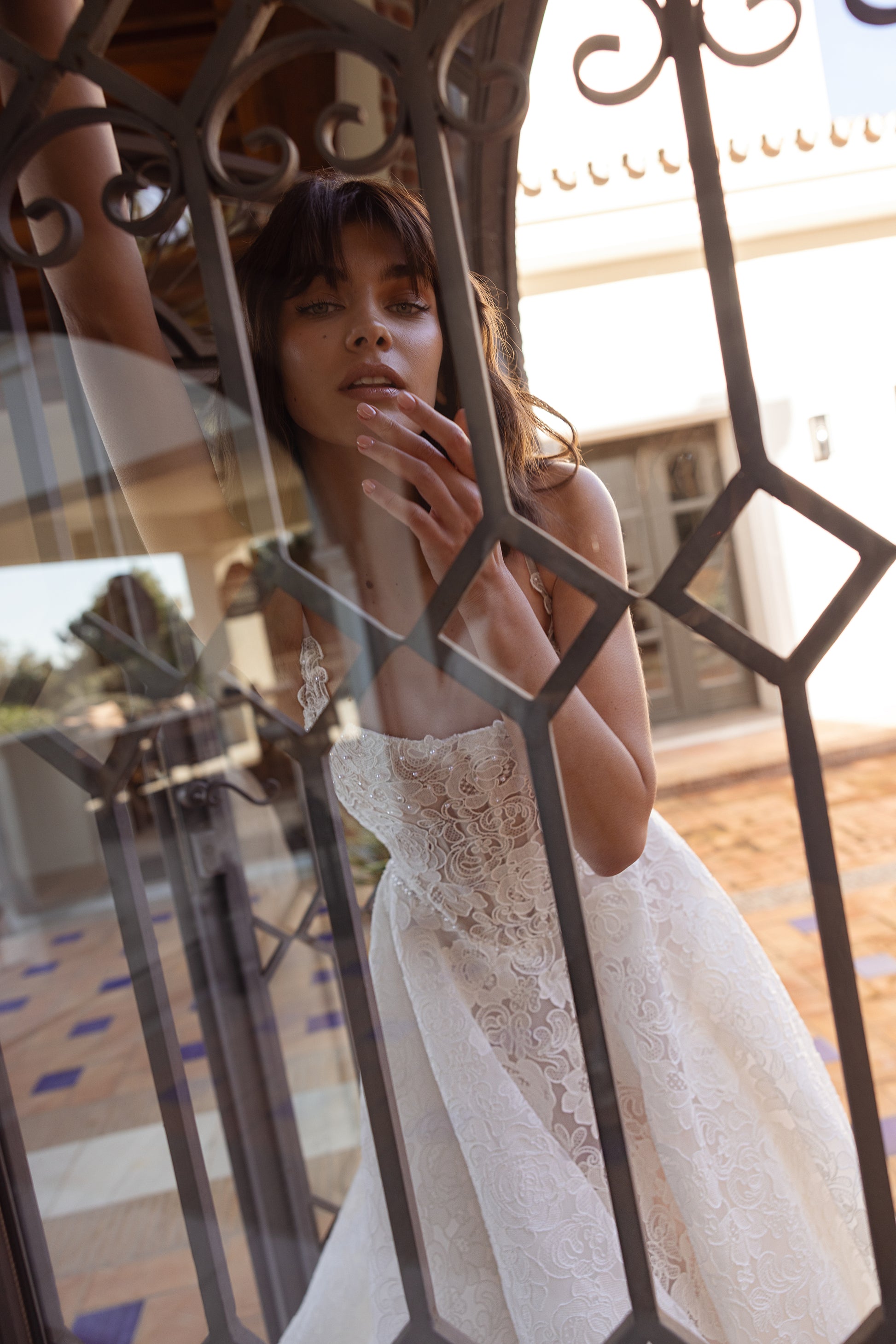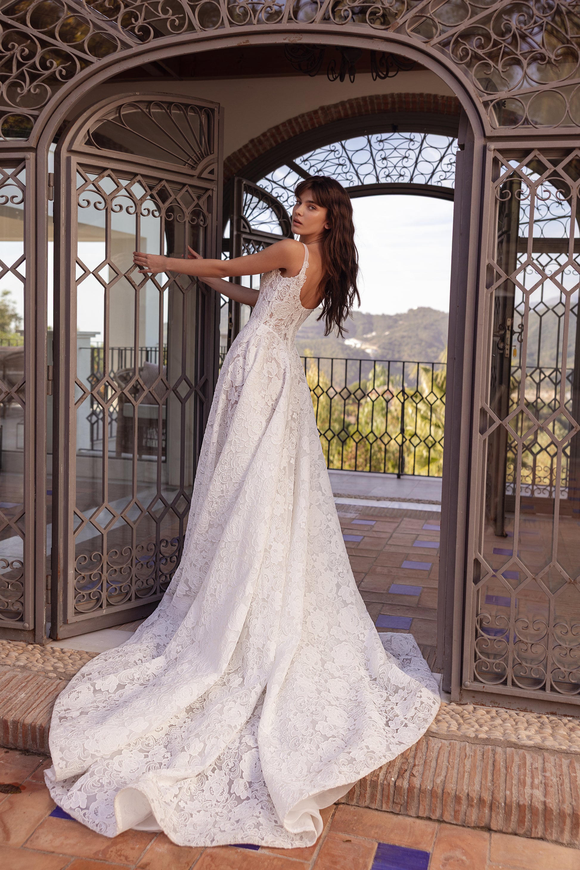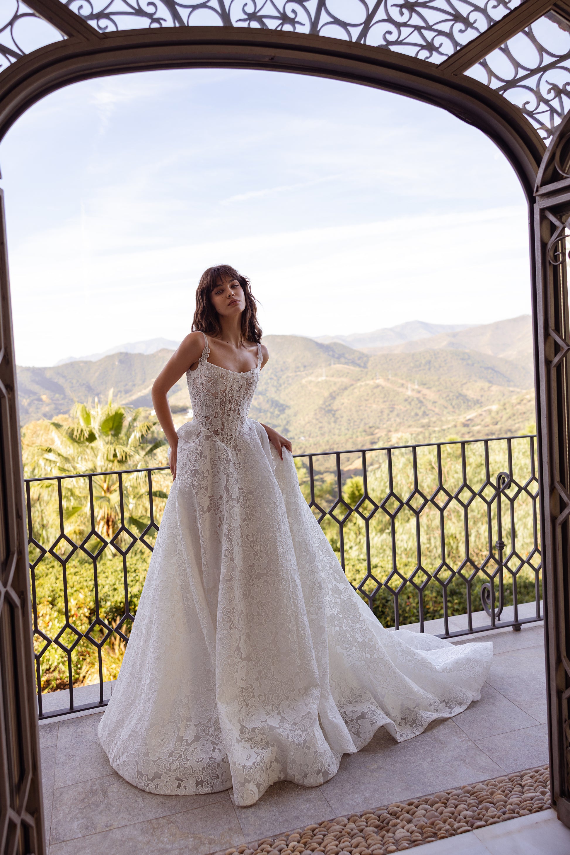 Hand-embroidered macramé lace adds rich texture to a soft A-line silhouette. A square neckline and delicate straps complete a design that feels artistic, feminine, and light.