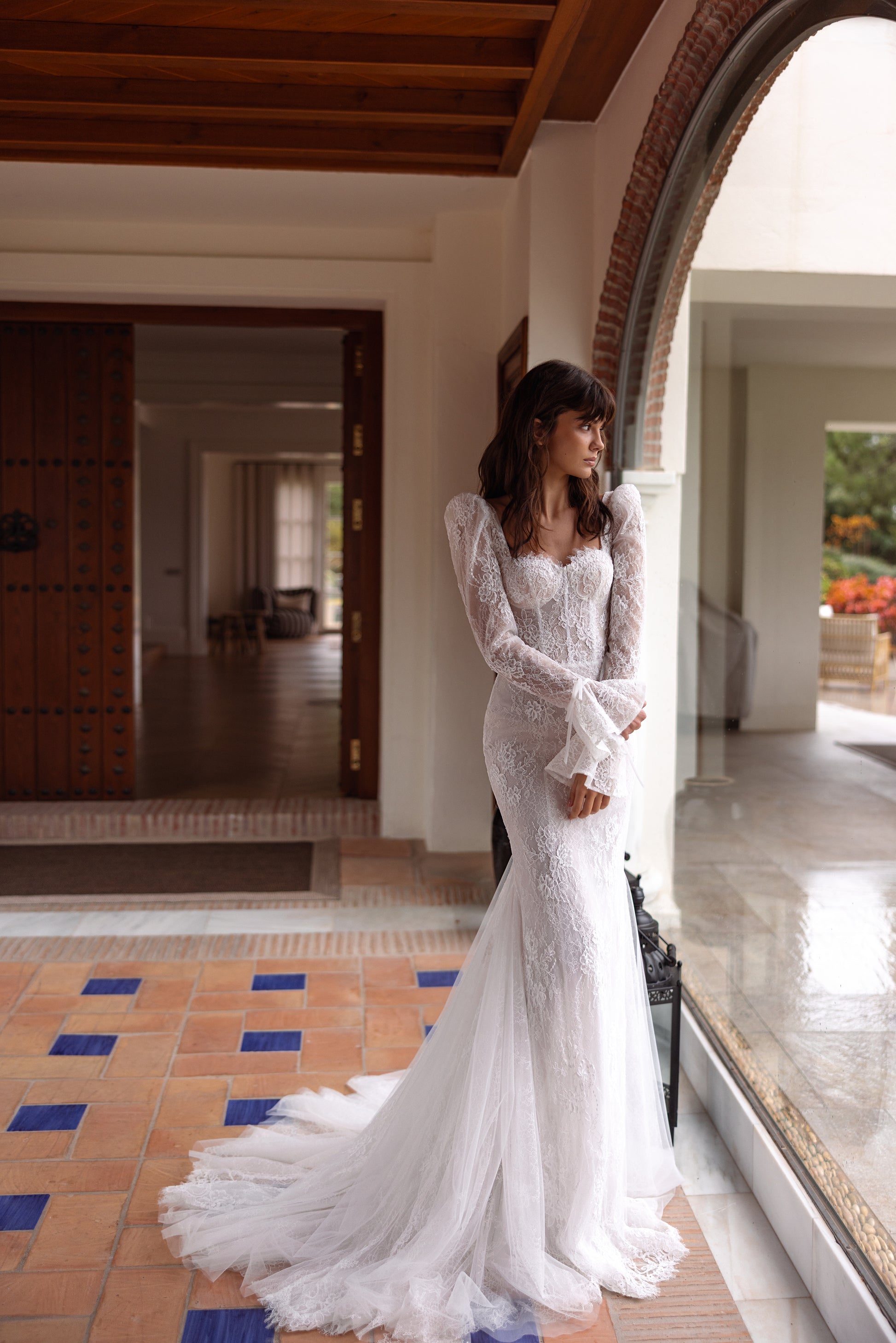Vionne is a refined mermaid gown that highlights the body with flawless precision. The corset bodice is built on a sheer base, covered with textured corded French lace that gives the pattern depth and definition. A soft sweetheart neckline adds femininity, while long sleeves in airy Chantilly lace feel light, delicate, and sensual. The silhouette hugs the figure through the hips and gently flares below the knees for an elegant yet confident finish.