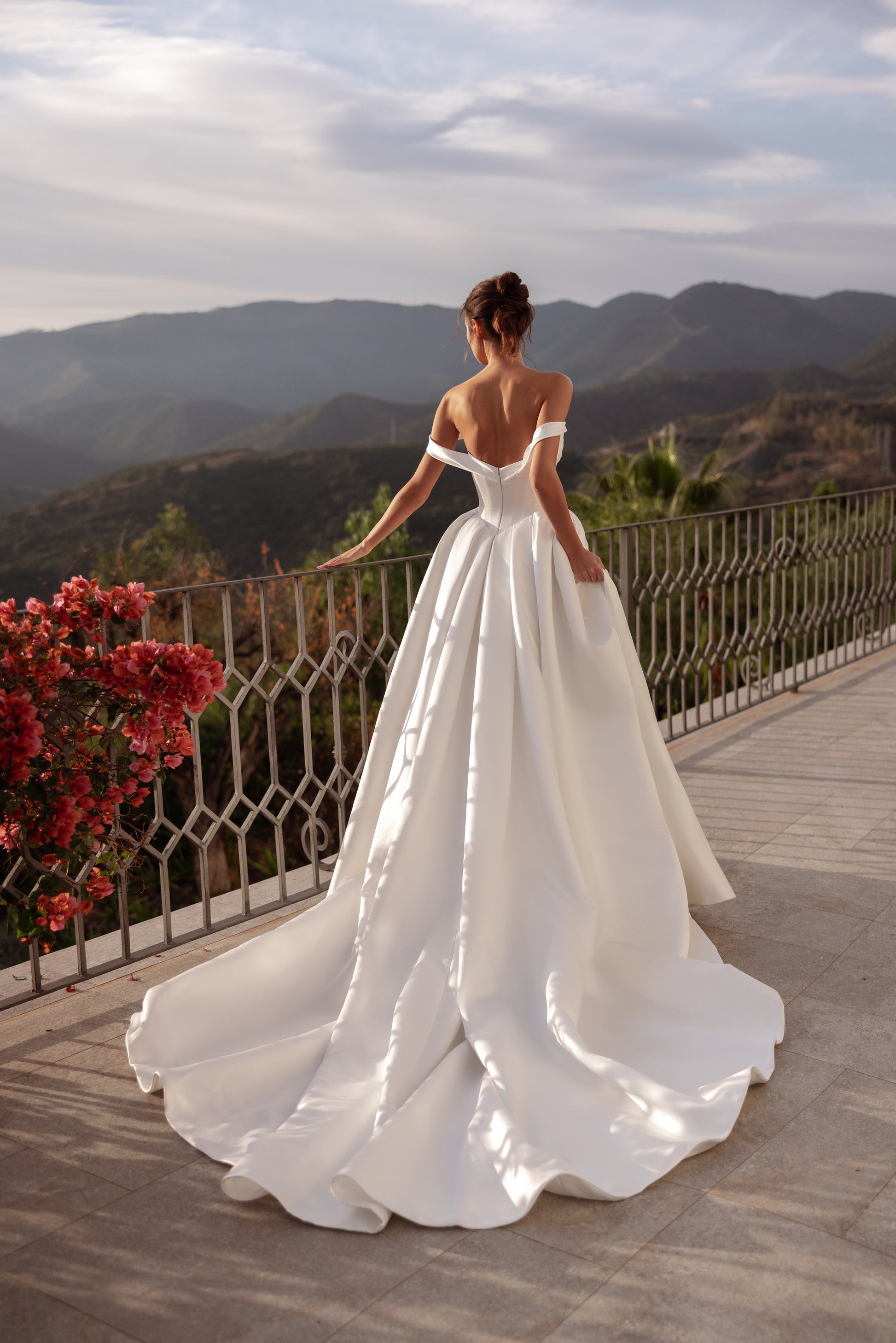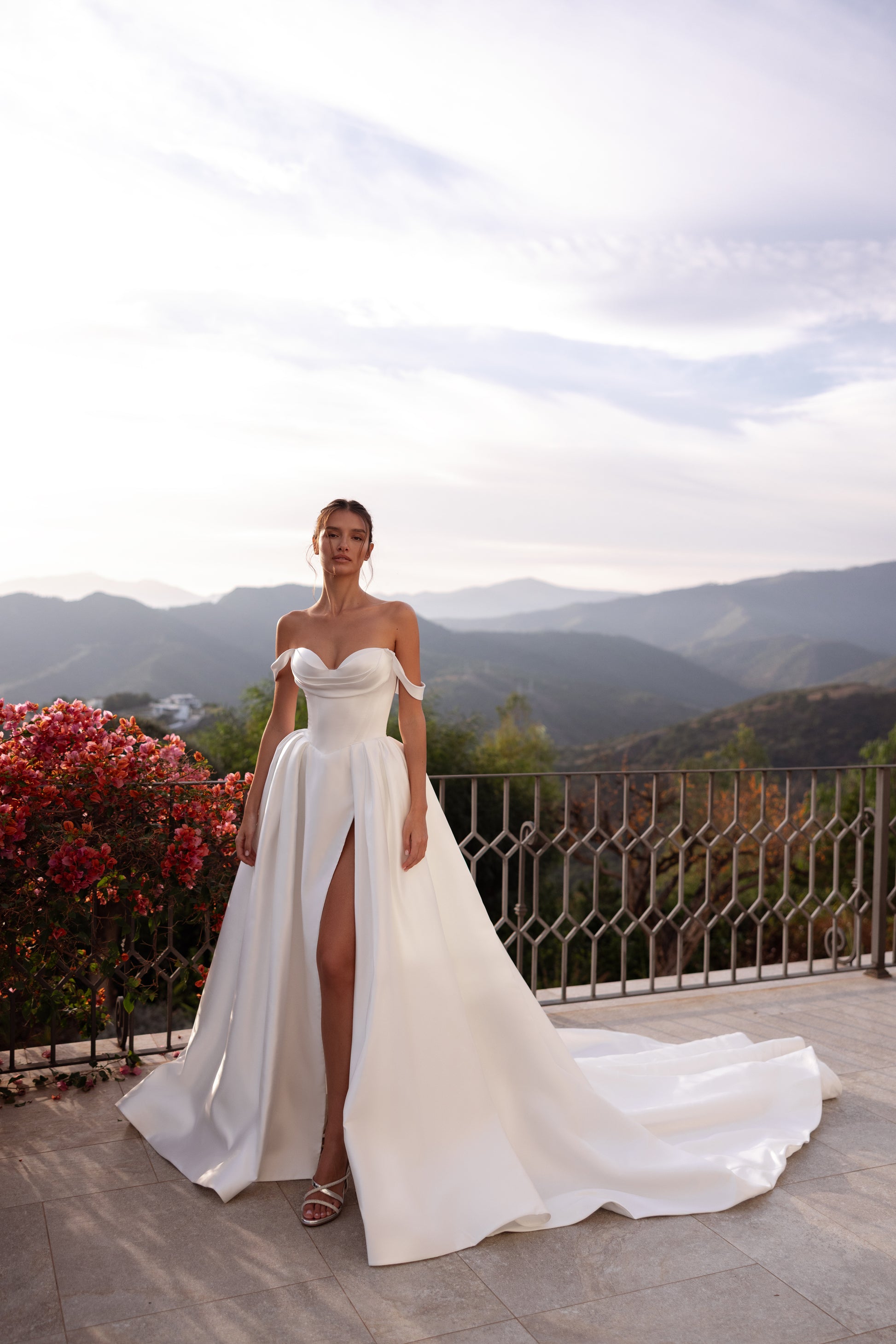 Whisper is a satin gown designed to sculpt the waist with a perfectly structured corset bodice. The sweetheart neckline is softened by elegant draping across the bust, while delicate off-the-shoulder straps add a romantic touch. The full princess skirt falls in rich folds and features a bold slit for a modern, confident statement. Finished with a flowing train, it feels effortless yet undeniably striking.