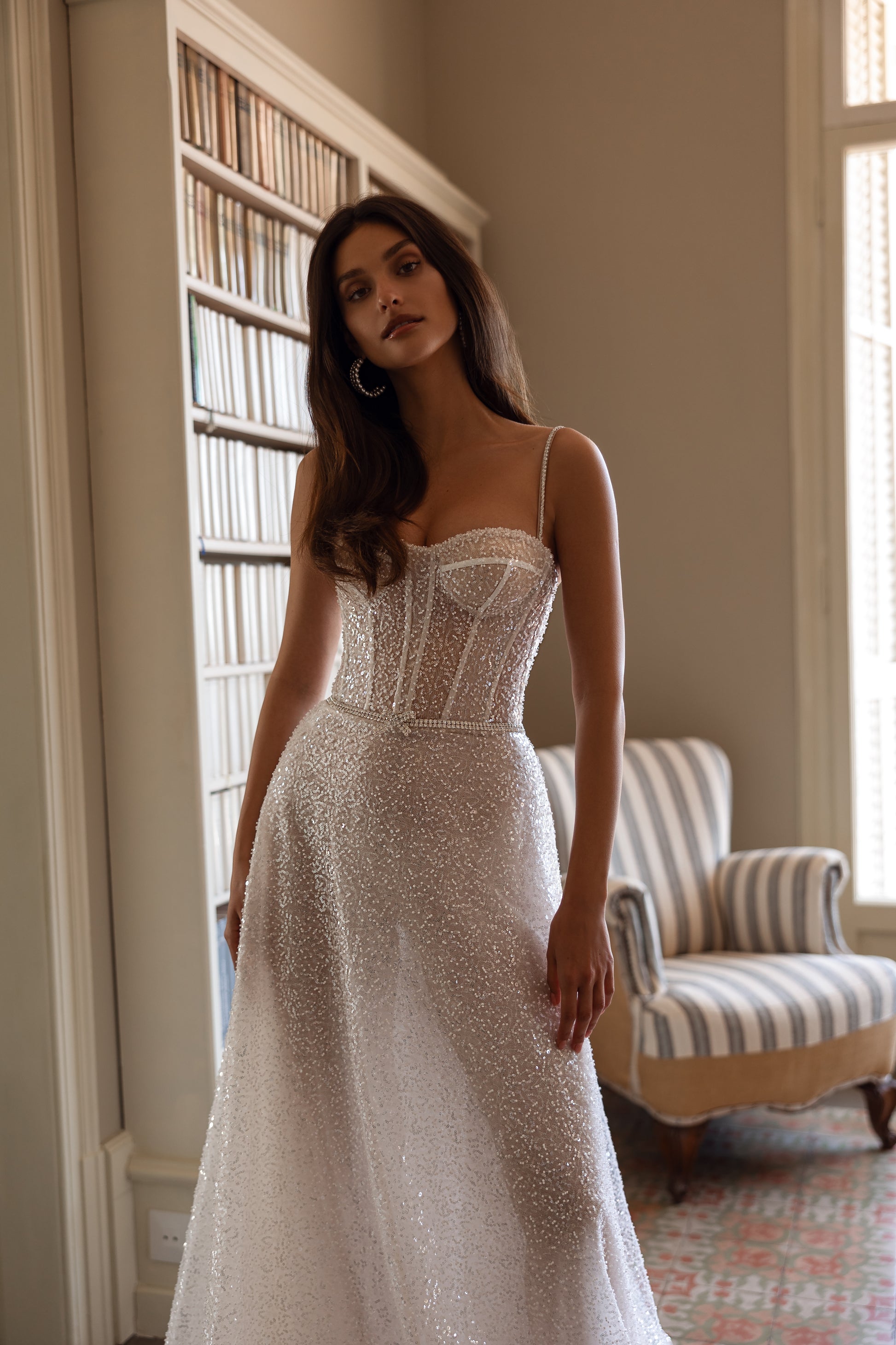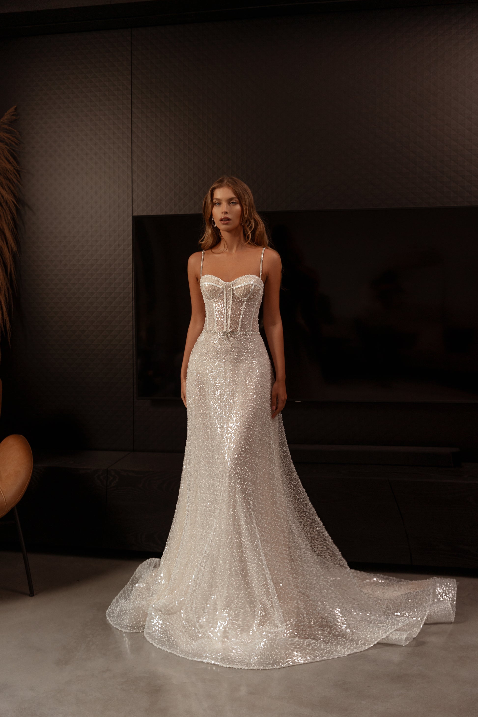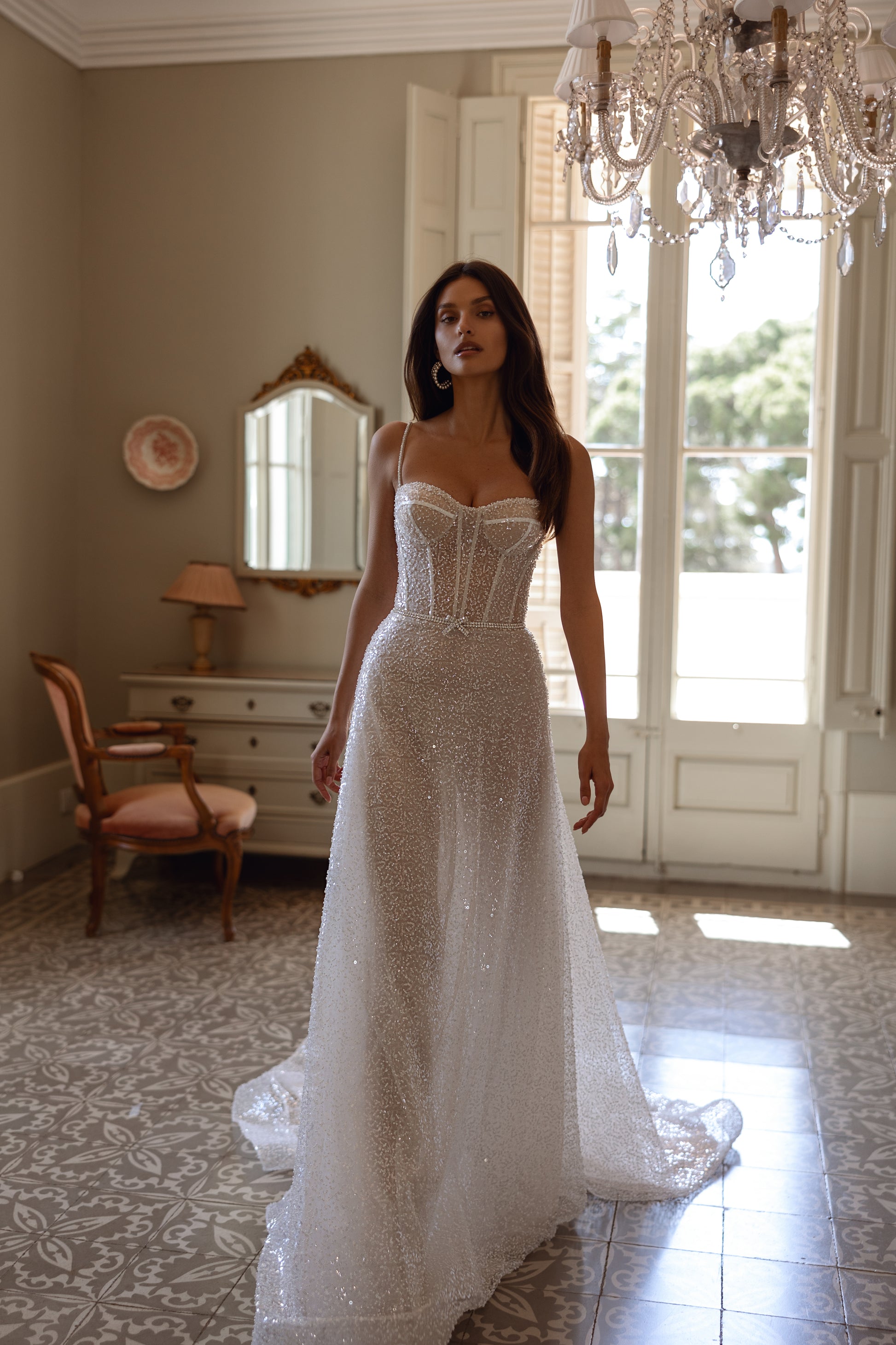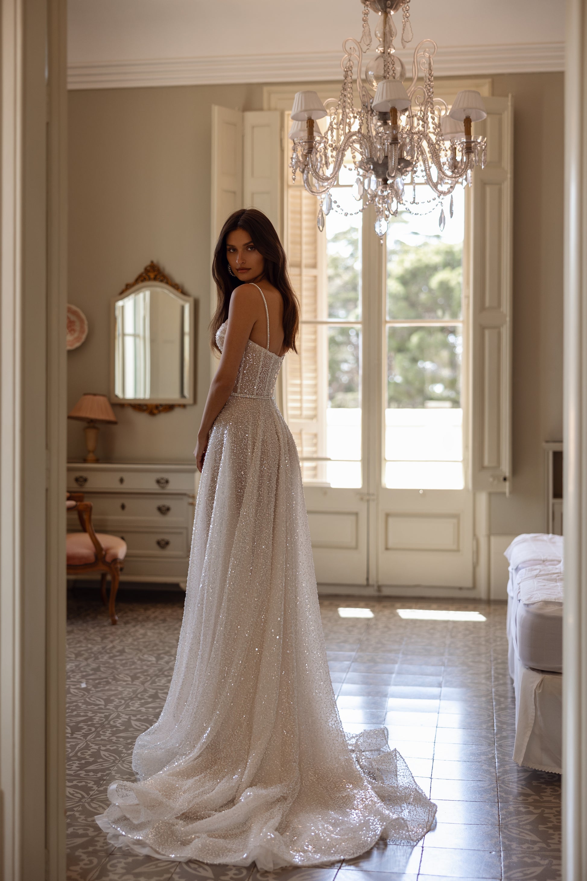 This cappuccino gown, made of lace with beads and sequins, is a perfect balance of elevated grace and fresh vibrancy. Majestic yet youthful, it combines boldness with a dreamy allure. A striking creation that embodies both elegance and a sense of whimsical charm.